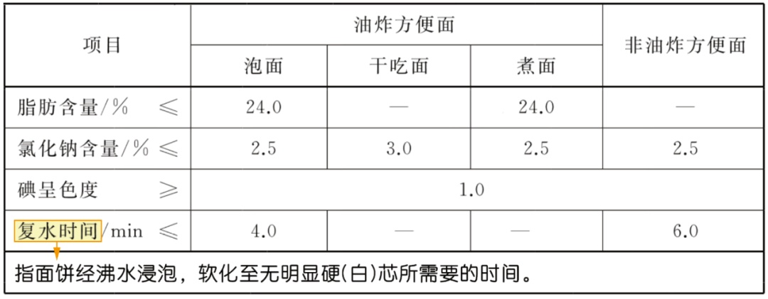 《方便面》(GB/T 40772-2021)中要求的非油炸方便面面饼复水时间要求比油炸方便面的稍长