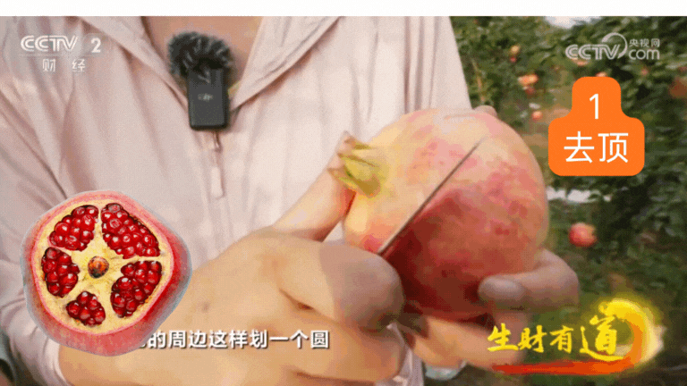 在石榴顶部(带花蒂的一端)轻轻切下一个“盖子”,能看到下方白色的筋膜即可。
