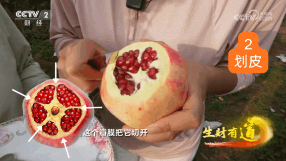 观察石榴表面,能看到几条微微凸起的白色瓣膜线。沿着这些线,用刀尖从上到下轻轻划开果皮。