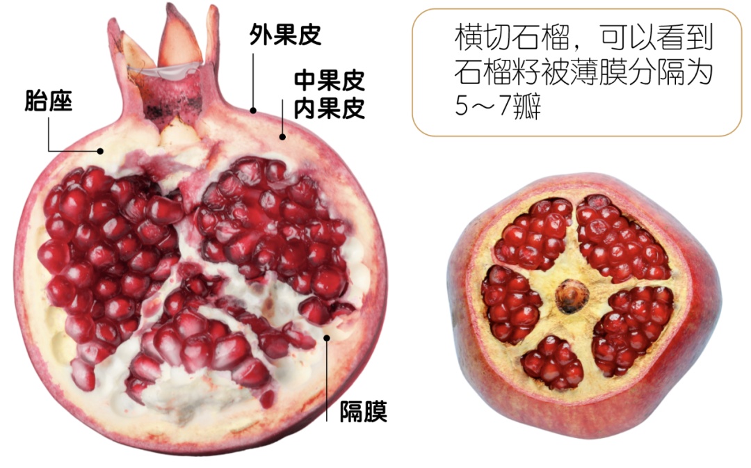 为了让更多种子能够顺利萌发,石榴果实中常含上百粒籽粒。每颗种子外层都包裹着一层透明多汁的假种皮,储存水分和养分,这也是我们日常食用的部分。
