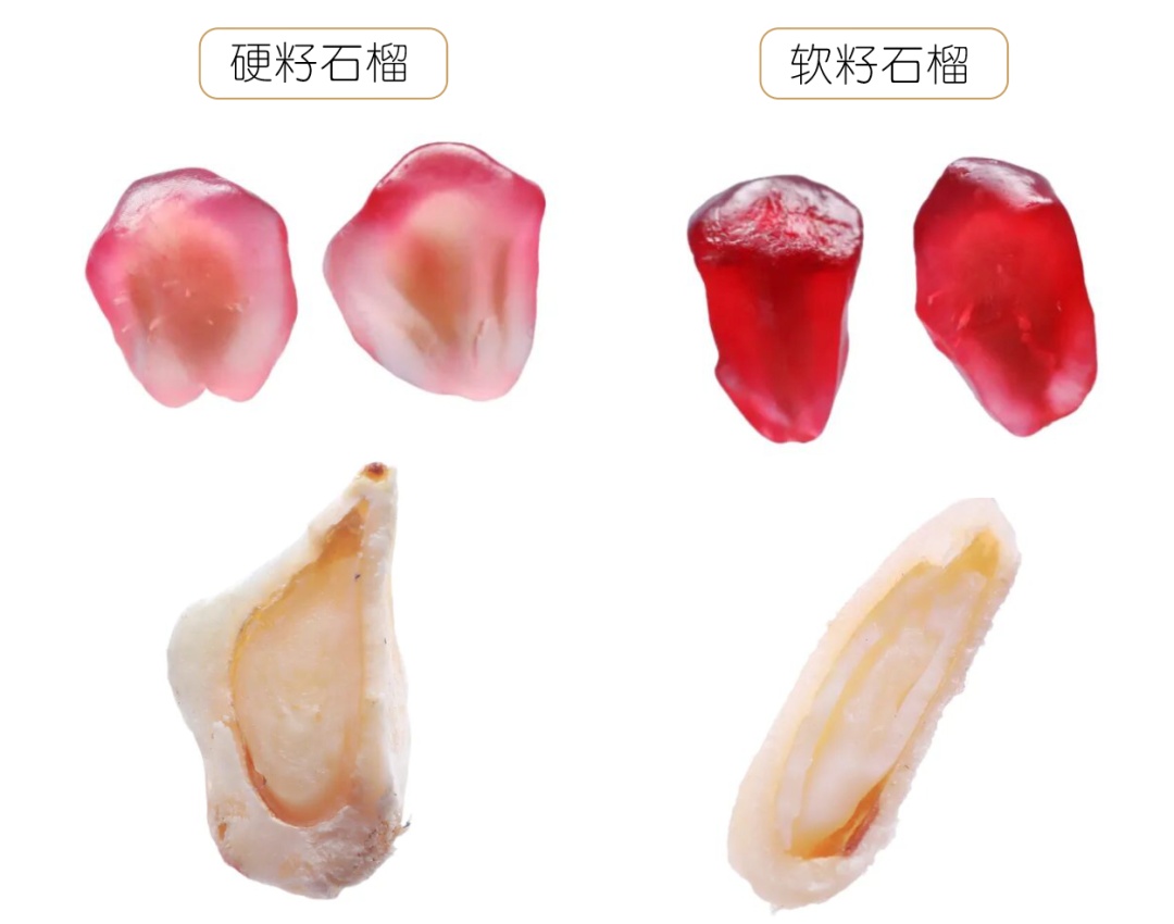 假种皮之内是真正的种皮和胚,我们常说的硬籽石榴与软籽石榴,区别主要就取决于其种皮的木质化程度。硬籽石榴的种皮细胞壁厚、木质素含量高,因而坚硬难嚼;而软籽石榴种皮较薄、木质化程度低,籽粒柔软可食。