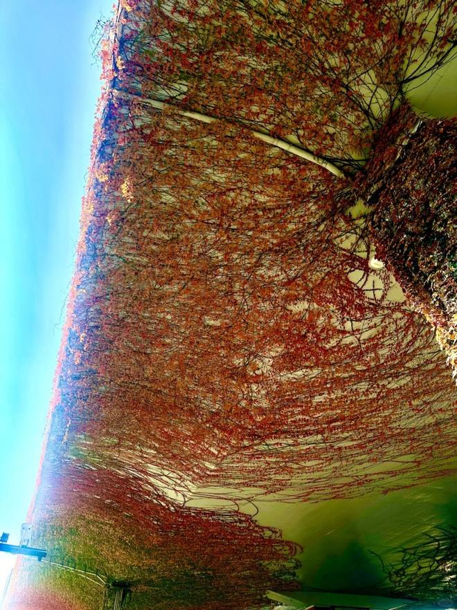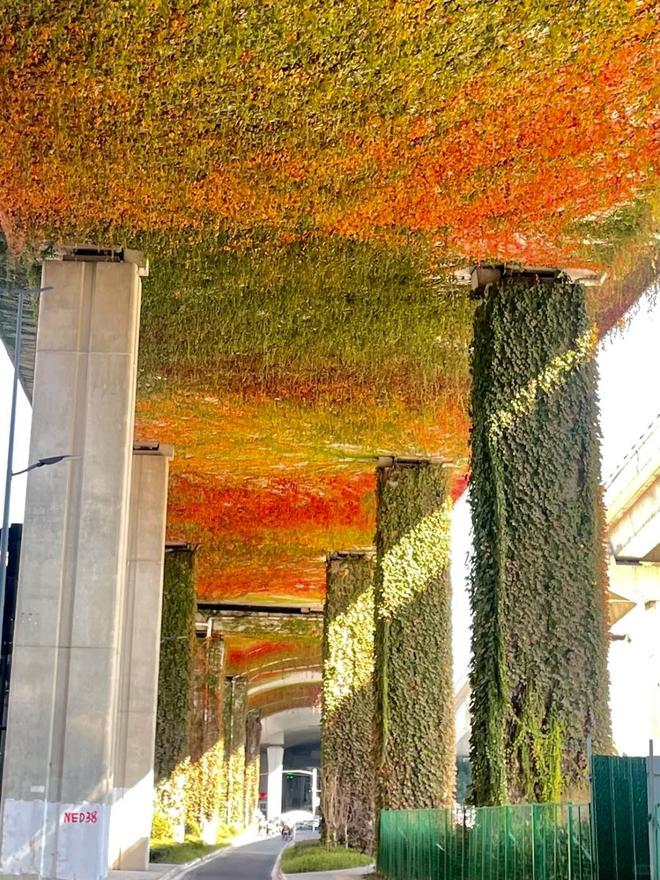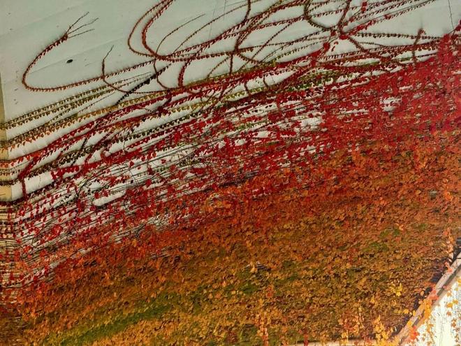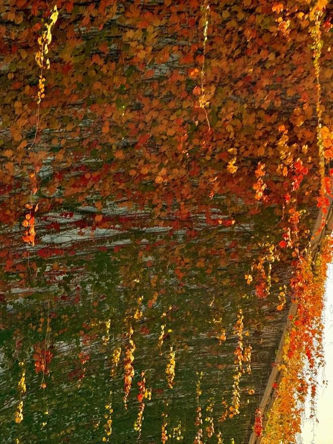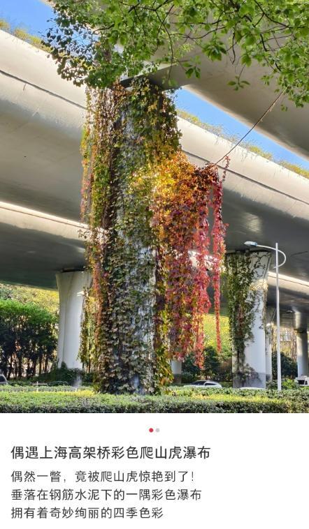 上海的高架桥柱在秋天换上了新装,爬山虎染上暖红,金银藤果实点缀,远看如一幅流动的暖色调油画。