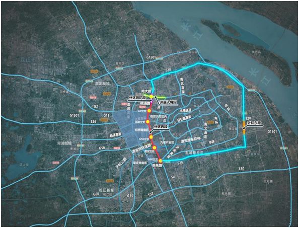 外环线位于上海市中心城外围,全长约99公里,途经闵行、长宁、嘉定、普陀、宝山、浦东、徐汇7个行政区,串联12条射线高速公路和10条射线快速路,是服务城市内外交通转换的重要通道,承担着货运与客运双重功能。