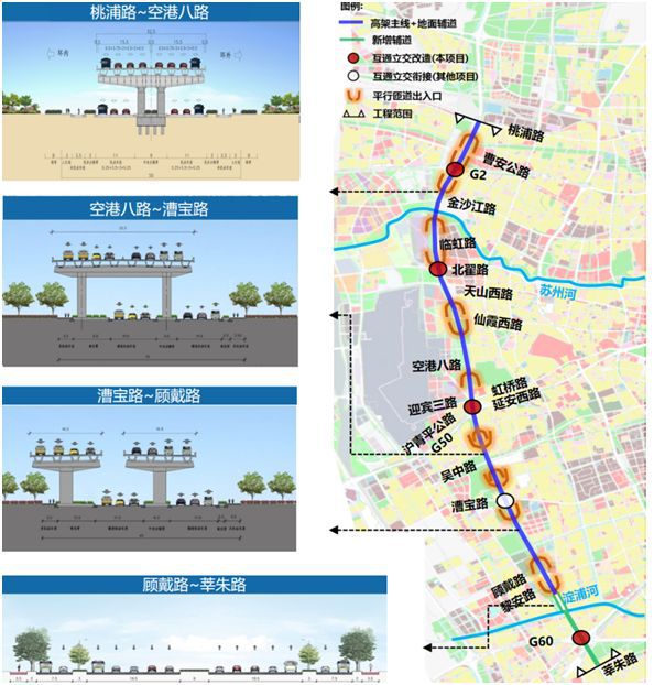 外环西段交通功能提升工程主线北起桃浦路、南至黎安路,全长约15.3公里,采用城市快速路标准,标准段采用双向8车道,地面辅道范围桃浦路至莘朱路,全长18.1km,双向4-6车道,共涉及嘉定、长宁、闵行三区。沿线改造G2、北翟路、G50三处互通立交,同步改造桃浦路、金沙江路、北翟路、天山西路、仙霞西路5条横向道路。项目建成后,可有效疏解沿线横向干道节点的交通压力,缓解节点性拥堵问题,打通西部高快速路网瓶颈,提升路网整体运行水平,激发城市活力,促进沿线区域经济社会发展。