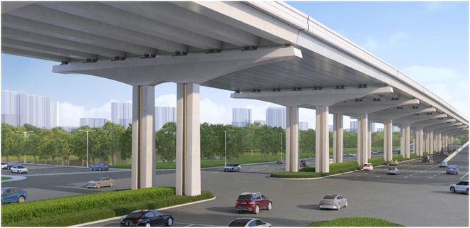 外环东段交通功能提升工程南起华夏中路,北至龙东大道,全长约4.0公里,采用主线高架双向8车道快速路地面双向6车道主干路标准建设,同步新建2对上下匝道、改造4条立交匝道。