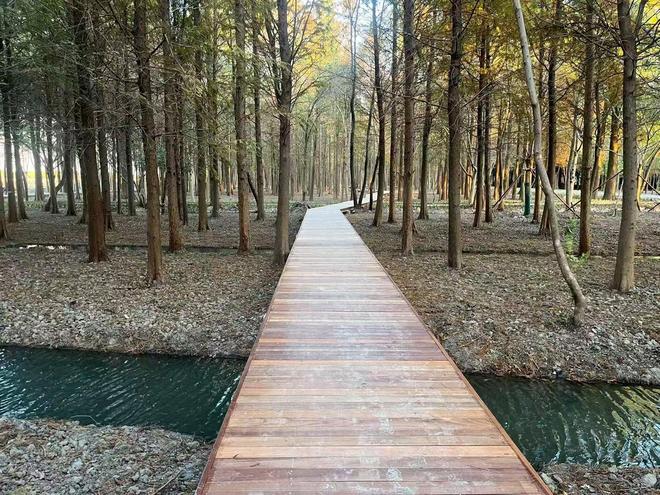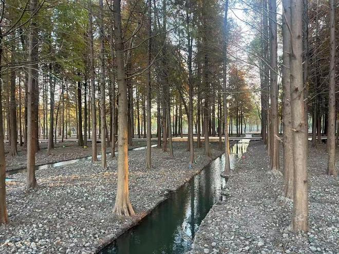 湿地总面积约119亩,坐落于上海黄浦江上游水源保护区内,东邻林地、西接乡界泾、南至新九路、北近黄浦江,坐拥天然洼地湿地的生态本底。项目以特色“膝根”景观为核心,通过科学的水系梳理、植被优化与生态营造,打造跌溪景观,贯通水系沟渠,构建出水质清澈、物种丰富的湿地生态空间。区域内以池杉、落羽杉、水杉为特色树种,划分林下溪流、林间观鸟区、膝根观赏区和水上森林四大主题区域。其中,林下溪流潺潺,串联起成片杉林,绘就灵动画卷;林间观鸟区植被茂盛,成为白鹭、黑水鸡等野生鸟类的理想栖息家园;水上森林以“树在水中长,水在林间流”的独特景致,勾勒出诗意盎然的湿地风光。