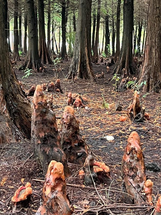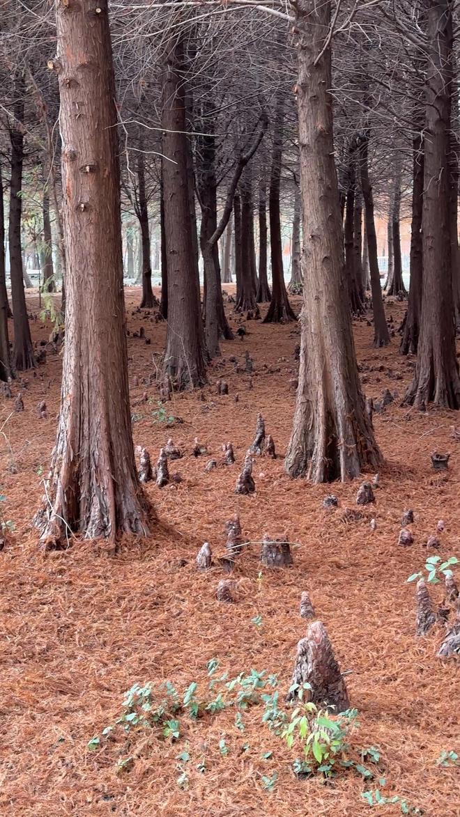 “膝根,是杉科植物的‘生存智慧结晶’。为适应湿地潮湿缺氧的生长环境,这类植物演化出特殊根系,从水中或淤泥里奋力向上生长,露出地面。”区林业站相关负责人介绍,这一独特结构既能帮助植株“呼吸”新鲜空气,又能稳稳支撑树干。更妙的是,膝根兼具生态价值与自然美学价值,有的弯曲如弓,有的挺拔如笋,形态别致、野趣十足。