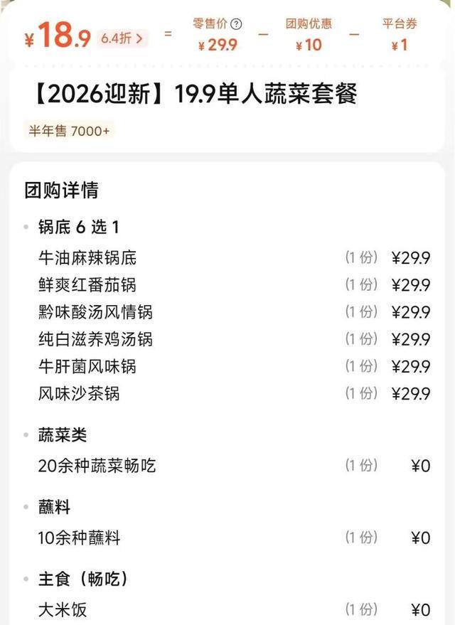 记者实地体验了一家打出“19.9元蔬菜畅吃”招牌的小火锅店。有趣的是,在打开地图软件找这家店的时候,意外看到它还显示了它在某平台18.9元的优惠价。不到二十块,真能顺利吃上一顿吗?会不会有隐藏消费?