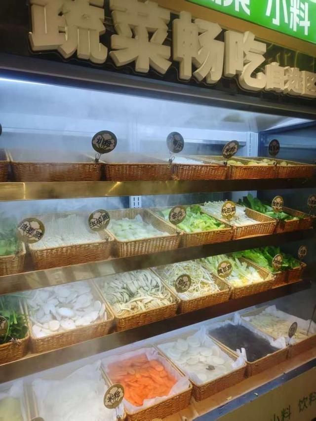 多层排列的的冷柜里,素菜“阵容”颇为壮观:小菠菜、油麦菜、杭白菜、小青菜、大娃娃菜、紫甘蓝、冬瓜、黄豆芽、金针菇、胡萝卜、黑木耳、玉米等蔬菜自不用说,还有百叶、腐竹、五香干等豆制品。若是“碳水脑袋”,也有生拉面、粉丝、川粉、米粉多种选择。