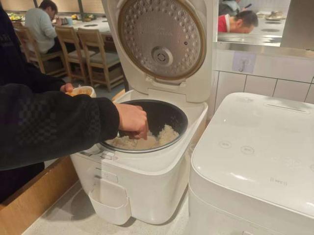 如果想吃米饭的,可以自己到一旁的电饭煲里打饭;想喝热茶的也能到保温桶里自斟,筷勺也自助拿取。