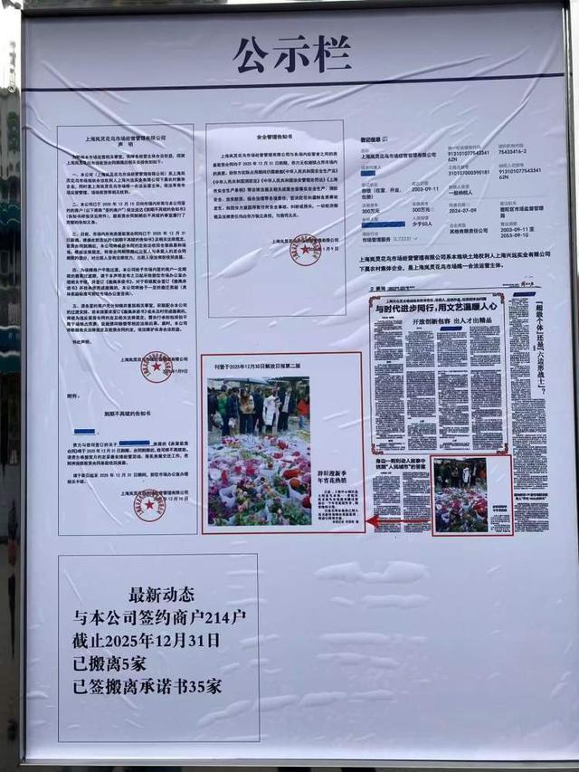 在岚灵花鸟市场看到,市场内多处都已经张贴了公告。公告表示,上海岚灵花鸟市场经营管理有限公司已经于2025年12月15日向市场内所有与该公司签约的商户送达《到期不再续约告知书》,目前,市场内所有房屋租赁合同已经于2025年12月31日届满,为保障商户平稳过渡,给予商户一定期限的搬离过渡期,对积极配合签订《搬离承诺书》并按照承诺完成搬离的,给予一定搬离奖励。