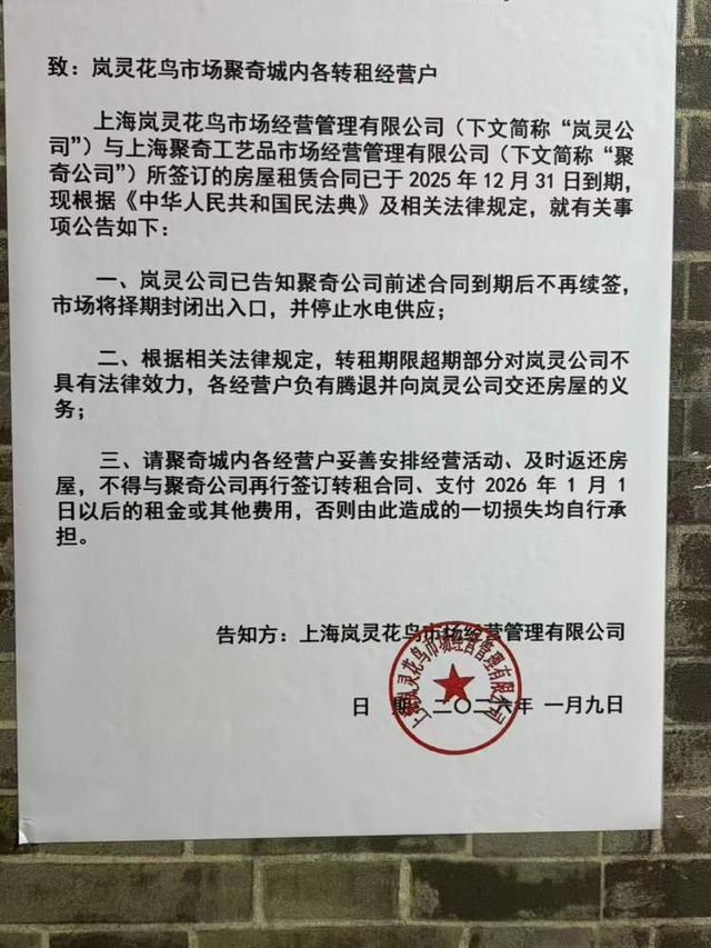 岚灵花鸟市场的最后面是聚奇城,主要经营古玩旧货等,是个收藏市场,在业界有一定知名度,特别是夏季的蟋蟀市场和每周的市集,吸引了全国各地的人来此淘宝。聚奇城的经营者是一对夫妇,从上海岚灵花鸟市场管理有限公司手中租下这幢楼,通俗来说,就是大房东和二房东的关系。公告表示,二者之间的房屋租赁合同已于2025年12月31日到期,不再续签,同时提醒聚奇城内的商户妥善安排经营活动,及时返还房屋,不要再支付今年的租金及其他费用,以免造成不必要的损失。