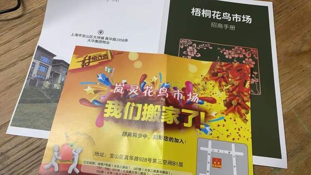 还有一个抛出橄榄枝的地方是米谷产业园,也是大场镇的一个产业园区,园区里已经出现“新岚灵,新机遇”的广告牌。另一个去处是共康花鸟市场,市场内已经拉出“欢迎岚灵市场商户入驻共康花鸟市场”的横幅。而据了解,聚奇城的老板陈祥、徐玉兰夫妇也已经在外面物色了一个场地。还有商户去咨询过虹桥花市的铺位情况。记者在花市采访还遇到了一家地产集团的销售,在发招租广告,“我们这个商业空间就在真华路,离这里不远,准备打造一个花鸟市场。”一家多肉店铺的老板娘则塞给记者一张广告纸,“我们准备搬去这里,已经谈好了,你以后过来。”记者一看,是真华路上另一个商业空间。