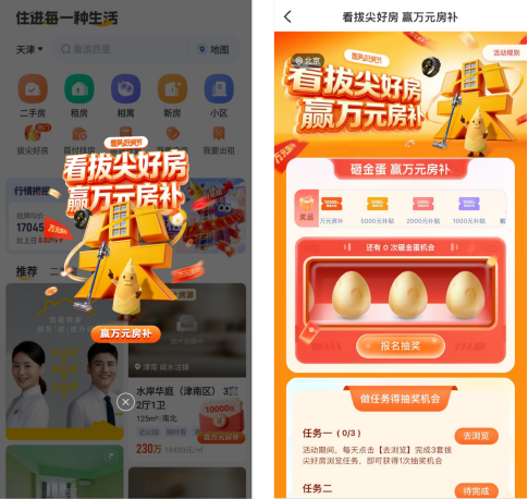 此次我爱我家“春笋好房节”除了推出“拔尖好房”功能外,还为九大城市的用户准备了赢万元房补等丰厚福利。活动期间,新老用户通过我爱我家APP、小程序进入“看拔尖好房 赢万元房补”活动页面,提交意向购房信息,完成活动报名,即可获得1次砸金蛋抽奖机会,若进一步完成活动页面指定任务,还可获得更多砸金蛋抽奖机会。奖品覆盖10000元、5000元等不同面值的房补,还有戴森吸尘器、华为运动手表等实用好礼。